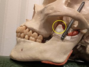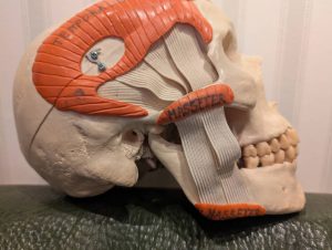 ●下顎を持ち上げて噛む筋肉(閉口筋)は、第二大臼歯の後方の下顎角から頬骨の間に「咬筋」という筋肉が深層と浅層で二重に付着しています。またもう一つの大きな筋肉で下顎骨の関節頭の前にある筋突起から頬骨の中を通ってこめかみの上から耳の穴の後ろまでの側頭部前面に扇状についているのが「側頭筋」です。この2つが顎をかみしめる力を発する筋肉です。